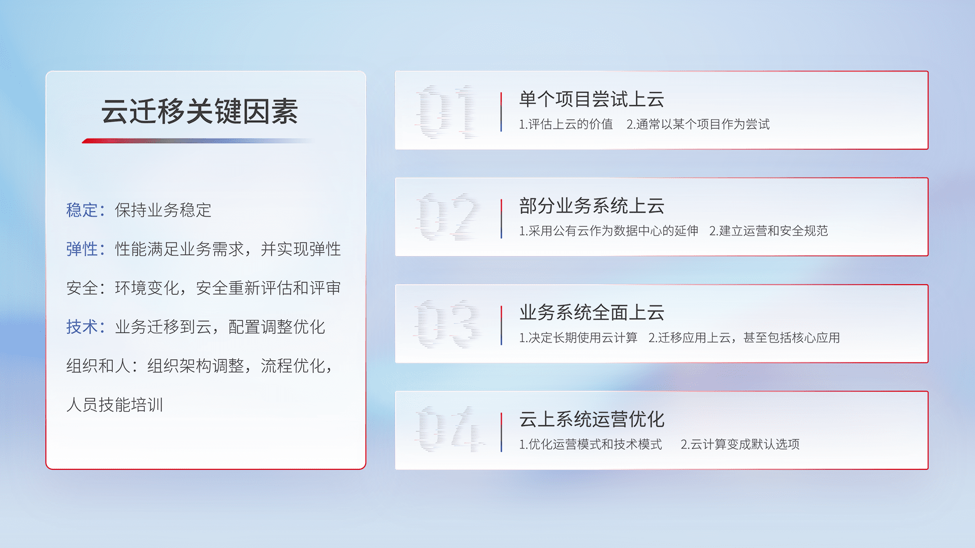 结合实际业务,,从规划设计、、云平台选型、、、、云原生改造、、、数据迁移、、、、集成交付,,迁移全过程为客户识别最佳上云路径,,,,做好风险识别管理,,设计网络架构、、身份权限、、、、安全审计合规、、、操作审计、、、日志审计、、、监控告警策略、、、多站点容灾设计等,,,,对云上基础设施进行整体规划,,,,提升IT治理水平,,,,以满足弹性、、高可用、、高性能的需求。。。